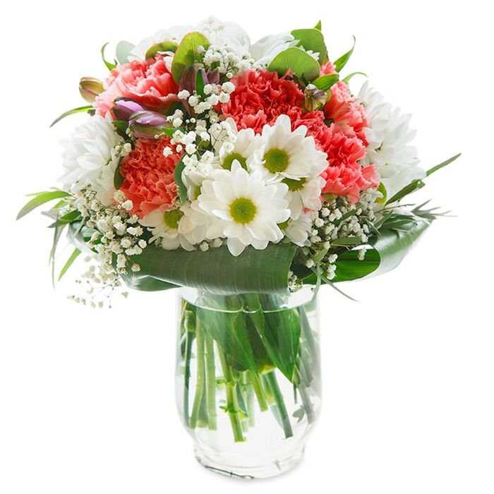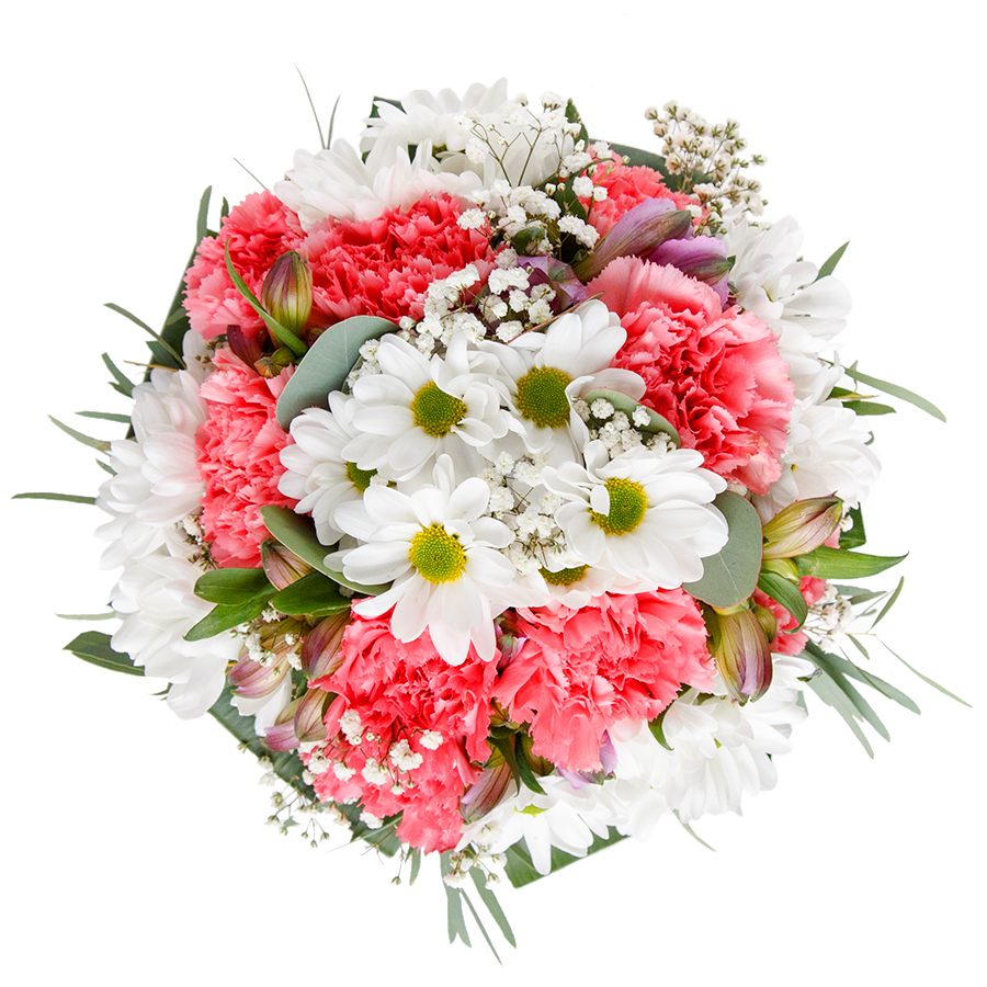 Enhance any occasion with our sophisticated and unique floral arrangement. This bouquet features a graceful mix of snow-white chrysanthemums, delicate gypsophila, and soft light pink carnations, elegantly wrapped in rich aspidistra leaves.